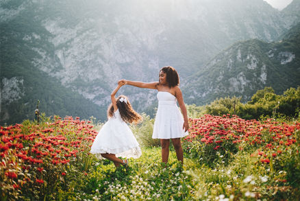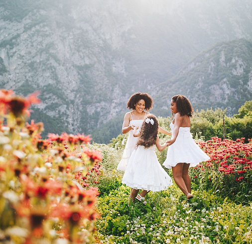 Fotografie di famiglia tra i bellissimi fiori dell'azienda agricola e agriturismo Il Ritorno, a San Lorenzo in Banale.